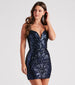 Tis' the season for you to glow at every party in this sequin mini dress featuring a sleeveless. plunge sweetheart neckline with a wire insert. spaghetti straps. an open lace-up back design. and a bodycon silhouette. Complete the look in metallic heels for a holiday soiree!