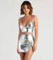 Get ready to glow and illuminate the night in this metallic crop top! It features a sleeveless V-neckline. spaghetti straps. a cropped. form-hugging fit. and a vibrant metallic sheen. The lightweight faux leather fabric has a moderate stretch. Complete your party look with the matching mini skirt.