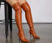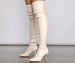 Level up your looks with glam boots that bring the drama! The boots feature a thigh high fit. a square toe. inner zipper closure. and a sleek stiletto heel. The boots are composed of a faux leather material. Complete look with a ribbed mini dress and crossbody for a date night look.