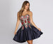 Conjure a little fairy tale magic in a dress truly fit for a princess! Our Lexi mini is made from a smooth satin and features intricate multi-color floral embroidery dotted with tiny iridescent beads from bust through waist. Lexi has a strapless bodice with lattice tie back. a padded bust. and flexible boning at sides. Her A-line skirt features a back zip. pockets at either hip. inverted pleats. and a tulle-trimmed underlay for added volume. Lexi is lined. has a more structured silhouette. and is made from woven materials with minimal stretch.