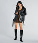 Take your life to the fast lane in this faux leather moto jacket! It features long sleeves with zipper cuffs. a lapel collar neckline with button details. an oversized silhouette for comfortable wear. a belted waist and front zipper closure. a faux buttoned flap pocket. and zippered side pockets for extra convenience. The sleek faux leather fabric includes a full woven lining. Complete the look in a basic mini dress and boots for a cute concert 'fit!