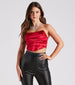 You're always the life of the party. so you need a sleek and sexy top to match! This corset features a strapless neckline with angled sides. ruched detailing at the bust. flexible boning at the bodice that peaks out toward the hem. and a fitted cropped hem. The lined satin-knit fabric has a luxe sheen that will make your outfit all the more glam. Style with faux leather pants and heels.