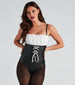 This Halloween. dress up as Lil' Red looking like a beauty on your way to Grandma's house! This lace-up corset bodysuit will give your costume the perfect blend of sultry and flirty. It features a sleeveless square neckline with a ruffled trim. adjustable spaghetti straps that can removed to make the bodysuit strapless. a ruched poplin bust. a faux leather corset-designed bodice with a lace-up front for a snatched silhouette. a cheeky bottom. and a form-hugging fit. Style with the velvet skater skirt. cape. and knee-high boots for a costume party!