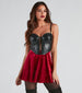 This Halloween. dress up as Lil Red looking like a beauty on your way to Grandma's house! This PU lace trim corset top will give your costume the perfect blend of sultry and flirty featuring a sweetheart neckline and a front crochet trim cutout detail to elevate the look. Complete the costume with the velvet cape. skirt. basket. or knee-high boots.