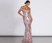 Shine above the rest in our Lilith sequin gown! She features an off shoulder bardot neckline. padded cups. a built in no slip strip. short sleeves. and a form fit. Her bodice leads to a horizontal hem line high waist and leads into a fitted skirt that flares to a floor sweeping hem. She is composed of a knit material with a beautiful sequin overlay with a geometric shaped pattern all over.