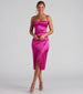 Enchant them all with the captivating Lillyanne formal midi dress! She features a sleeveless bodice. a trendy cowl neckline. adjustable spaghetti straps for a customized fit. and a strappy cross-back design. Her high waist seam elongates your silhouette and leads to a mid-length skirt with an asymmetrical wrap hem creating a front slit. The midi dress is composed of a satin fabric that offers a curve-hugging fit with a moderate stretch. Complete the look with clear heels and a sleek satin clutch.