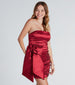 Your fabulous presence in the Lindsay taffeta bow mini dress will be such a gift to everyone at holiday parties. banquets. and school dances! She features a strapless neckline. a padded bust. a pleated bodycon silhouette. a statement side bow that adds a captivating touch of chic. and a mini-length hem. The formal mini dress is crafted from a taffeta woven fabric with a subtle sheen for an effortless glow and has a sewn-in knit lining to provide comfort. Complete the look in sassy platform heels and a bolero.