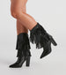 You'll scoot and boogie to the beat in these cowgirl boots for a night of line dancing! They feature a pointed toe. block heel. side zipper closure. and an under-the-knee shaft length with fringe on faux leather material. Complete the look in a western style hat.