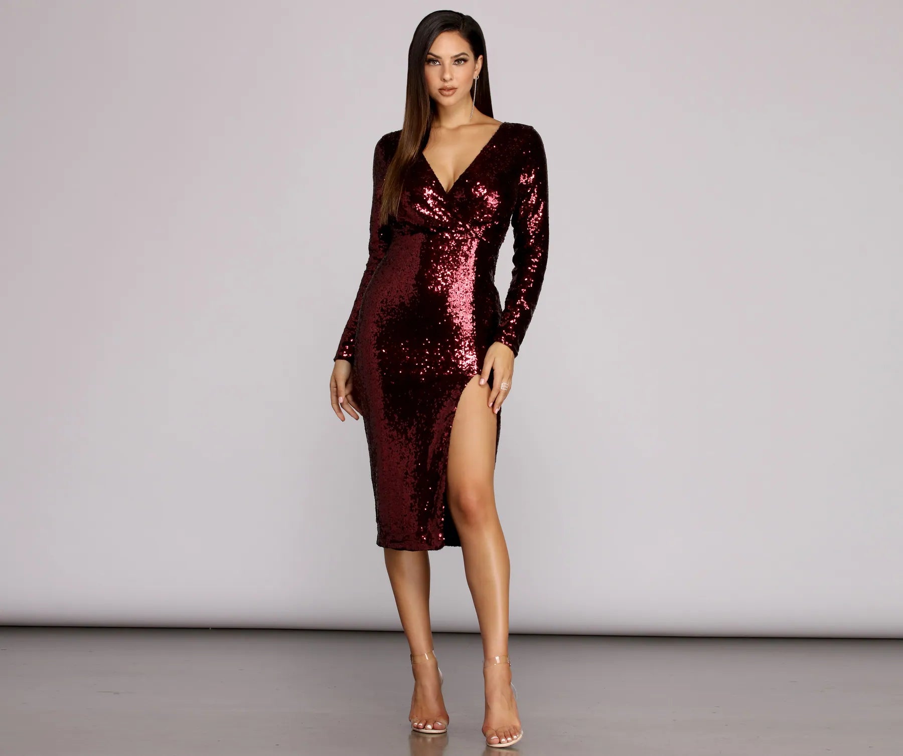 Lend your sparkle a distinctly sophisticated aura in our lovely Linley dress! She features all-over sequin embellishment. a surplice bodice with deep V neckline and back zip. long sleeves. and a curve-hugging midi-length pencil skirt with side slit at front. Linley is fully lined and made from a woven material with little to no stretch.