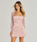 Create a chic and sleek party look in the Liora formal mini dress designed with smooth satin woven fabric and sheer lace long fitted sleeves for a touch of allure. It features a square neckline with a padded bust for support. an open back with a lace-up design for a customized fit. and a short A-line silhouette.