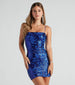 Hey babe. live it up and light up the dance floor in this stunning sequin mini dress! It features a sleeveless square neckline. bungee spaghetti straps. and a short. form-hugging silhouette. The sheer mesh fabric includes a full knit lining and has a chic all-over sequin scroll embroidered design. Complete the look with platform heels.