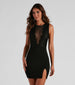 Create a sheer moment in this sultry lace dress! This must-have date night dress features a partially sheer lace bodice with a crew neckline and a plunging V-neck mesh inset. The back features a matching sheer mesh back. The slim-fit bodice leads to a mini-length silhouette with a mini side slit. Complete your look with stiletto heels.