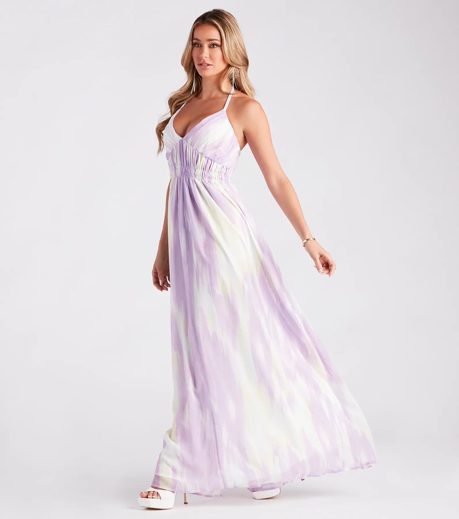 Live life in color! Easy and breezy. this chiffon maxi dress is perfect for all of your summer activities. It features a sleeveless halter V-neckline. a unique braided neck strap with tie closure. a stretchy smocked back. and a flowy silhouette. The dress is designed with an airy chiffon fabric showcasing a watercolor print and a woven lining. Complete the look with a sleek arm cuff bracelet.