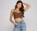 Live that luxe life with a glitzy bustier! The bustier features a sleeveless sweetheart neckline. spaghetti straps that lead to cross back. lace-up back. and a cropped hem. The bustier is composed of a crochet lurex knit fabric that offers a form hugging fit with a moderate stretch. Complete look with high waist jeans.