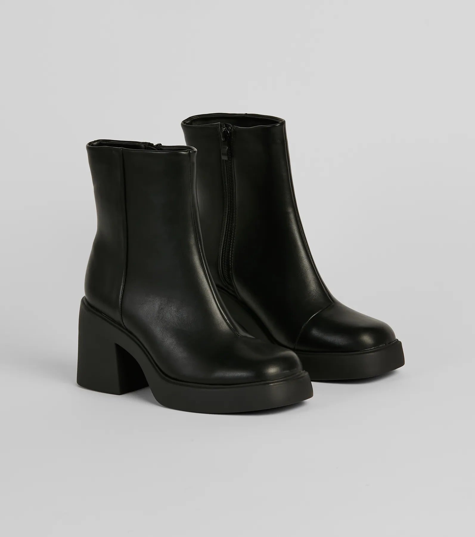 These platform block heel booties will amp up your style and have you looking sleek this season! They feature an above-the-ankle height. a square toe. an inner zipper closure for easy on-and-off wear. a trendy platform sole. and a sturdy block heel. The booties are composed of a smooth faux leather material. Style with a cropped sweater and mini skirt for the cutest fall look!