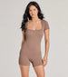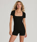 Get obsessed with leisurely days when all you need is this rib knit romper and an iced latte! Crafted with a stretchy rib knit fabric. this romper will keep you feeling snug all day long with its perfect form-hugging fit. Featuring short sleeves. a square neckline. and a short-length hem. you'll love running errands or lounging in it. Complete the look with sneakers and a cropped jacket.Â