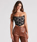 Romance yourself! Fall for this corset top featuring a strapless curved neckline. a lace mesh overlay. flexible boning. and a cropped hem. Style with sleek faux leather pants to complete the look!Â