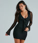 Live out your love story starting with this mesh mini dress for a dark romance vibe! It features sheer fitted long sleeves with ruffled cuffs. a V-neckline with ruffle trim. a flattering bodycon silhouette. and a center front ruffled trim. Complete the look in rhinestone heels.