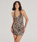 You'll love the sultry details of this leopard print mini dress featuring a sleeveless plunging V-neckline with tie-back halter straps and an alluring open back with lower bar straps. The short bodycon silhouette will showcase your stunning curves.