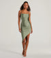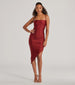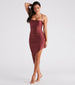 You'll love the way you look in this head-turning midi dress featuring a sleeveless cowl neckline. spaghetti straps. an open lace-up back design. a pleated side seam. and an asymmetrical hem with a side cutout. The dress is composed of a stretchy knit fabric with a subtle sheen. Complete the look in platform block heels.