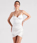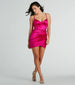 You'll love to go out dancing in this satin short dress featuring a sleeveless V-neck. spaghetti straps. a princess seam bodice. bodycon fit. and a faux wrap asymmetrical hem with pleating. Complete the look in sassy block heels.