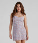 You'll look lovely in this floral mini dress featuring a sleeveless. cowl neck. bungee spaghetti straps. and form-fitting silhouette on woven fabric with an inner knit lining. Complete the look in sleek wedges.