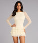 Soft romance meets modern elegance. This long sleeve mini dress stuns with a floral-pattern lace overlay. flirty tiered ruffle skirt. and open tie-back detail that feels effortlessly chic from every angle. Perfect for bridal celebrations. brunch. or dressy parties.