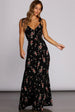 Create a look to fall for in charming florals! The dress features a V neckline. shoulder tie straps. an elastic waist and a sweeping floor length maxi length. Dress is composed of a stretchy smooth knit fabric that offers a form hugging fit.