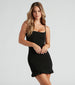 Love the limelight? Attract all the attention in this crepe mini dress featuring a sleeveless. scoop neck. spaghetti straps. princess seams along the bodycon silhouette. and a flirty ruffled hem. Complete your dressy look in fringe earrings and heels.