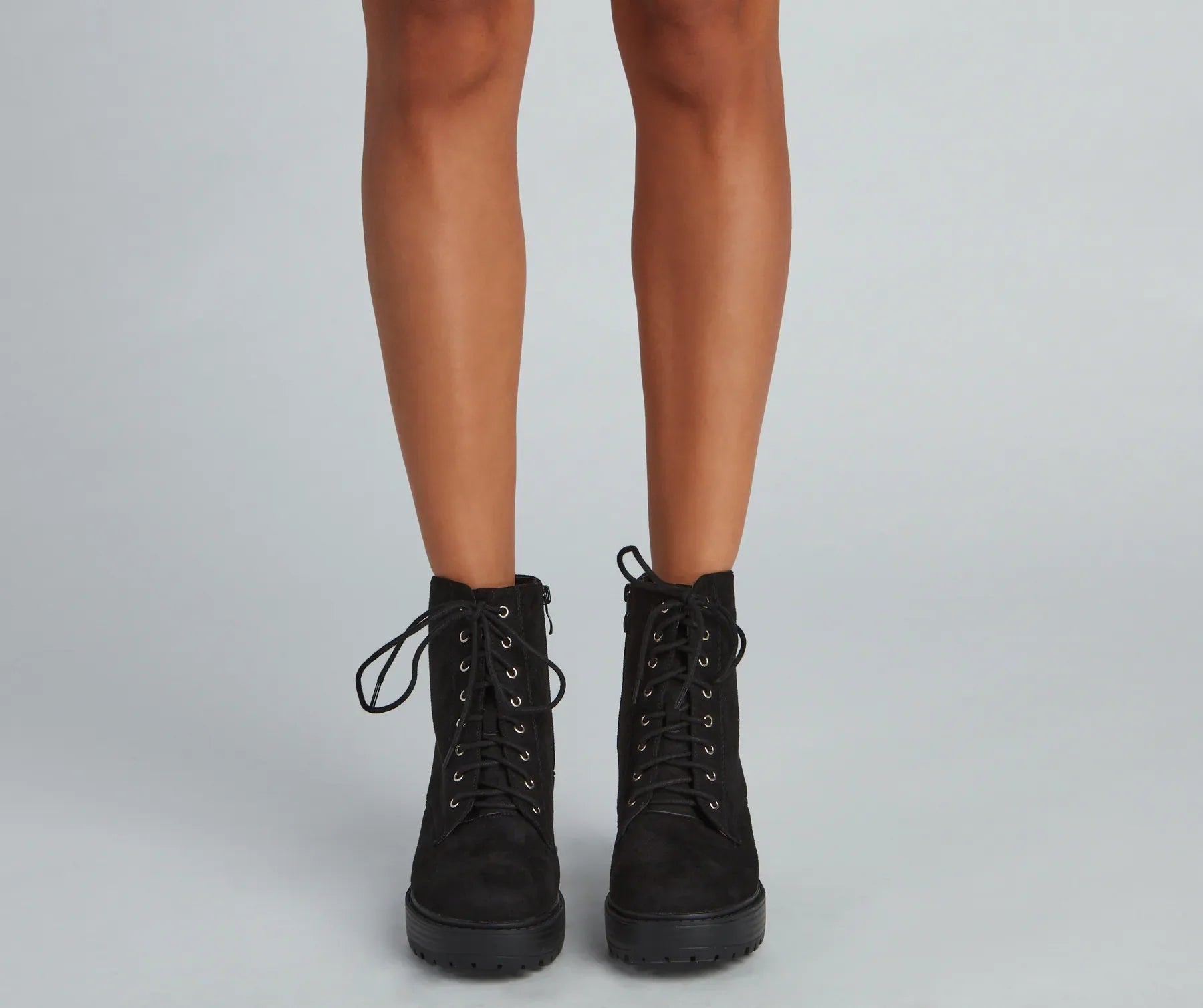 Stomp your feet to the beat of these lug boots! They feature an almond toe design. block heel. front lace-up with self-tie. and a side zipper closure. Complete your edgy look with a bodysuit and denim.