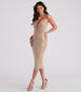 Fancy yourself as a radiant beauty in the stunning Luisa party dress? Every jaw will drop when you step into the formal dance or celebration in this sparkling midi dress featuring a sleeveless V-neckline with a sheer mesh insert. rhinestone embellished and adjustable spaghetti straps. and a bodycon silhouette. The party dress is composed of a partially lined mesh fabric with all-over rhinestone and faux pearl embellishments in a clustered vertical design to accentuate your curves! Style with fringe earrings and clear block heels to complete the look.