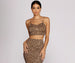 Embrace the matching set trend! This lush top is a cropped top with bungee style spaghetti straps. The top is fully lined and composed of an extremely soft knit material that showcases a very on trend pattern! The hem of this crop hits at the rib cage. top offers a form fit with moderate stretch. Don't forget the matching skirt to complete your fierce look!