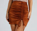 You're not dreaming. this satin mini skirt is so luxe and perfect for a night out! It features a high-rise waist. front slit with ruching and tie accent. Composed of a stretch-knit fabric with a moderate stretch. Style with a glitter bodysuit and heels.
