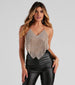 Live it up in luxe with a crop top that brings the shine. It features a trendy halter neck. a halter top chain strap. and a cropped hem with fringe. Whether you are going out for drinks. or you are heading out to a party. style this piece with faux leather bottoms.