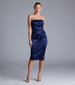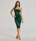 Show off a luxe sheen in this curve-hugging midi dress designed with smooth satin-knit fabric perfect for your next cocktail party. It features a strapless straight-across neckline. ruched side and back seams to flaunt your stunning figure. and a back slit accent at the midi-length hem.