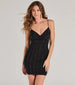 Dazzle in a sleeveless mini dress with a sleeveless v-neckline. adjustable spaghetti straps for a secure fit. and rhinestone embellishments on a stretchy mesh fabric. Perfect for styling with a sleek clutch and fringe earrings.Â