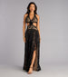 Designed for the woman who knows how to captivate a room. the Lyla formal dress pairs romantic lace fabric with an effortless a-line floor-length silhouette. The halter neckline with a rosette. side waist cutouts. and front ruffle trim slit creates a sculpted. eye-catching moment that feels equal parts daring and refined.