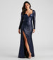 Sparkle up the room in the captivating and chic Lyra sequin mermaid dress. She features a plunging sweetheart neckline with a notched center detail. padded cups. long fitted sleeves. a dramatic floor-length hem in a curve-hugging mermaid silhouette. and an alluring high side slit to showcase some leg. The all-over sequin embroidery provides the prettiest shine to amp up the glam factor. Complete your formal look with rhinestone hoops.