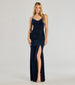 The velvet glitter dress features a sleeveless cowl neckline. adjustable spaghetti straps that cross at the back. an open back design. a high side slit. and a long hem length with a mermaid silhouette. Complete the formal outfit with a rhinestone clutch.