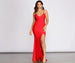 Our gorgeous Maci mermaid dress is a mesmerizing vision! She features a sleeveless V neckline. dual spaghetti straps that lead to a cross-back and lace-up back design. and a floor-length mermaid silhouette with a sultry thigh-high front slit. Doll up your look with sparkly earrings and an embellished clutch!