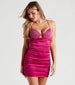 This sultry satin mini dress was made for you to have your it-girl moment! It features a sleeveless sweetheart neckline with a bustier-style bodice. padded and structured cups. alluring rhinestone embellishments at the bust. and rhinestone-adorned spaghetti straps. The dress features a backless design with tie-back straps. ruched detailing down the sides and back. and a short. curve-hugging silhouette. The smooth satin fabric includes a full knit lining. Style with hoop earrings.