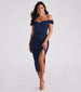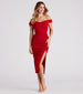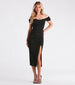 A closet staple for your upcoming weddings or dressy events. the Madi formal midi dress evokes a clean and pristine allure so you'll always feel classy! She features an off-the-shoulder. sweetheart neckline. foldover short-sleeve cuffs. and a form-hugging silhouette with a front side ruched seam atop a sultry side slit along her midi-length hem. The formal dress is composed of a stretch-knit crepe fabric that hugs your body like a glove! Complete the look with twisted rhinestone earrings.