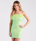 Shine like never before in the Mae party mini dress crafted with light-catching sequins sure to mesmerize every room! Perfect for formal birthdays. bachelorettes. and banquets. She features a flirty strapless neckline adorned with feather trim. a bodycon silhouette. and a mini-length hem. The party mini dress is composed of a sequin-embellished mesh fabric with a stretchy knit lining. Complete the look in platform heels and a clutch.