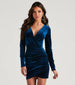 Make magic happen in this velvet short dress for your next dressy night out! It features long fitted sleeves. a V-neckline. a high waist seam that leads to the side pleating and an asymmetrical style hem. and a bodycon silhouette. Complete your stunning look in glitter block heels.