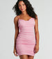 The Maizie glitter party mini dress is ready to shine at bachelorettes. birthdays. and the club! Showcasing a dazzling glitter allure. she features a flattering V-neckline. padded bra cups for support. adjustable spaghetti straps for a customizable fit. and side ruched seams that accentuate your curves along the bodycon silhouette. Complete the look in strappy platform heels and earrings for the best night out!