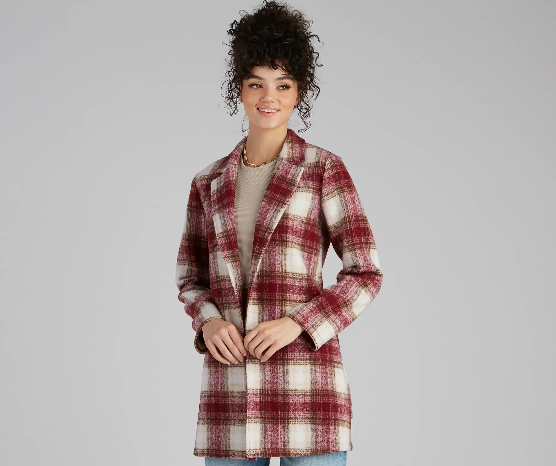 Bring that major chic vibe this season with a trendy coat! The coat features a plaid print. a draped open front. long sleeves. hidden side pockets. and a longline length. The jacket is composed of a faux wool fabric that offers a relaxed fit with minimal stretch. Complete look with thigh-high boots and skinny jeans.Â