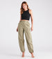 Give off major cool girl vibes with these trendy parachute cargo pants! They feature a high-rise waist with an elasticized back waistband. dual front and back pockets. cargo-style side pockets. a relaxed silhouette. and elastic drawstrings at the hems to create a tapered jogger fit. The lightweight smooth cotton fabric has no stretch. Style with a crop top and clear mules!