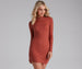 Wow in a mini dress that makes them all take a double take! The dress features a mock neck. long sleeves. a sexy cutout at the back. and a mini-length hem. The dress is composed of a lined ribbed knit fabric that offers a form hugging fit with a moderate stretch. Complete look with ankle booties and a trench coat.