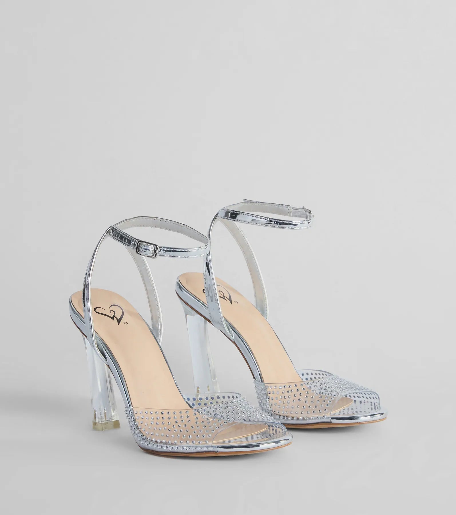 Bring major glam vibes to birthday parties or bachelorette festivities in these rhinestone chrome clear block heels! Designed with sleek faux leather with a reflective chrome sheen. they feature an open almond-shaped toe. a wide clear strap across the foot with sparkling rhinestone embellishments. thin adjustable ankle and heel straps. and a tall thin clear block heel. Style with a glitter clutch!