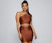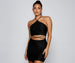 Create a major headturning moment in a mini dress that slays! The dress features a halter neck. spaghetti straps. a sexy midriff cutout with sleek bar straps. and a mini-length silhouette. The dress is composed of a smooth knit fabric that offers a form hugging fit with a moderate stretch. Complete look with clear heels and dainty rings.